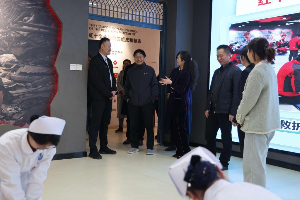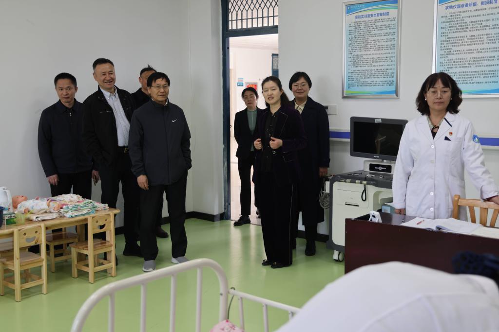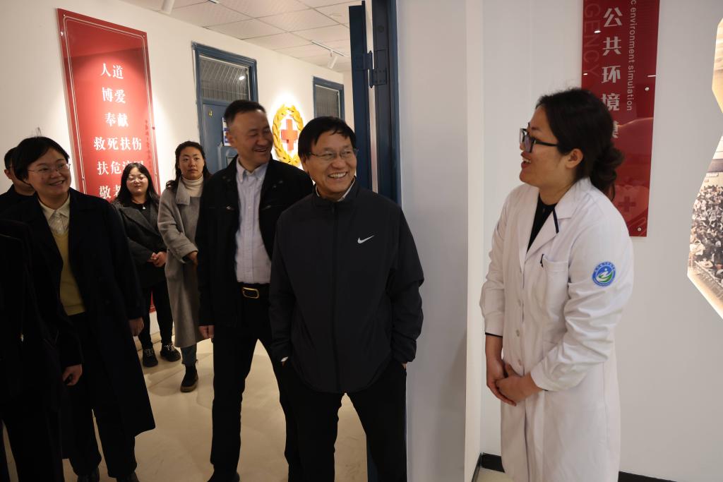 随后,张学记一行来到护理学院,先后参观了红十字文化宣传长廊、应急救护培训工作站和养老护理实训室,听取护理学院软硬件建设、日常活动开展及未来发展规划等情况介绍,现场观看了应急救护教学,亲切慰问正在积极备赛养老护理大赛的师生团队。张学记对于护理学院的快速发展,尤其在红十字文化培育、护理专业群建设和应急救护培训等方面工作取得的突出成绩给予了高度评价。