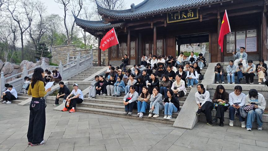 历经两小时跋涉,师生队伍抵达琅琊山南天门。在这里,生物医药学院党总支副书记曹慧敏为大家讲述了长征途中年仅17岁的小战士郑金煜的故事——这位“红小鬼”始终背着行军锅冲锋在前,直至献出生命。“以前总觉得长征精神离我们有些遥远,但听到和自己年龄相仿的小红军的事迹,才真切体会到信仰的力量超越时代。”药学专业王同学感慨道,“我们医药学子的‘长征’同样任重道远,一样要在专业道路上坚守初心、奋勇前行。”