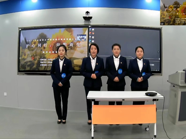 本次校级决赛是公共教学部参加团队最多的一次,而且全部为女教师。三支团队分别来自心理教研室的“护心同行,向阳而生”和英语教研室的“职业准备”与“健康护航”。风雨彩虹,铿锵玫瑰,经过精心准备,她们身着统一的队服,个个妆容靓丽,光彩照人,竞赛气氛紧张热烈。