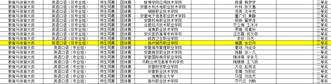 日前,由安徽省教育厅、安徽省人力资源和社会保障厅、安徽省经济和信息化厅联合主办的2023年“中银杯”安徽省职业院校技能大赛(高职组)“英语口语”赛项成绩已经公示。公共教学部臧晨老师与其指导的2023级学前教育专业余云丹同学在赛场上凭借扎实的语言功底、默契的配合取得了省赛三等奖的好成绩。实现了我校在该项赛事中的零突破。