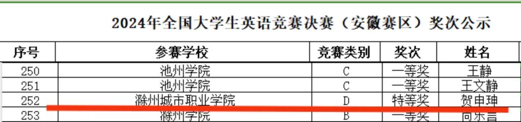 5月19日,2024年全国大学生英语竞赛决赛(安徽赛区)在安徽大学举行,我校医学院22级学生贺申珅在大学英语教研室陈晶晶老师的悉心指导下,与来自省内本科、高职院校的众多选手同台竞技,发挥出色,荣获特等奖。
