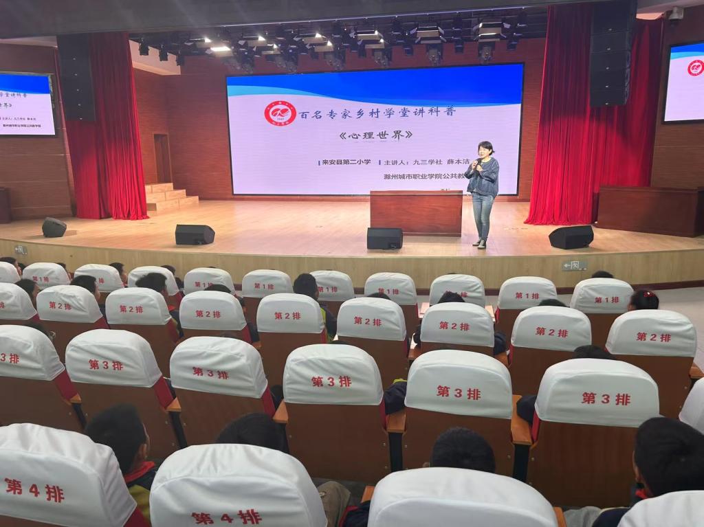 近日,公共教学部副教授、国家二级心理咨询师薛本洁受滁州市科协邀请,赴定远县民族学校、界牌中学、吴圩小学及来安县第二小学等4所学校开展以“心理世界”为主题的科普讲座。