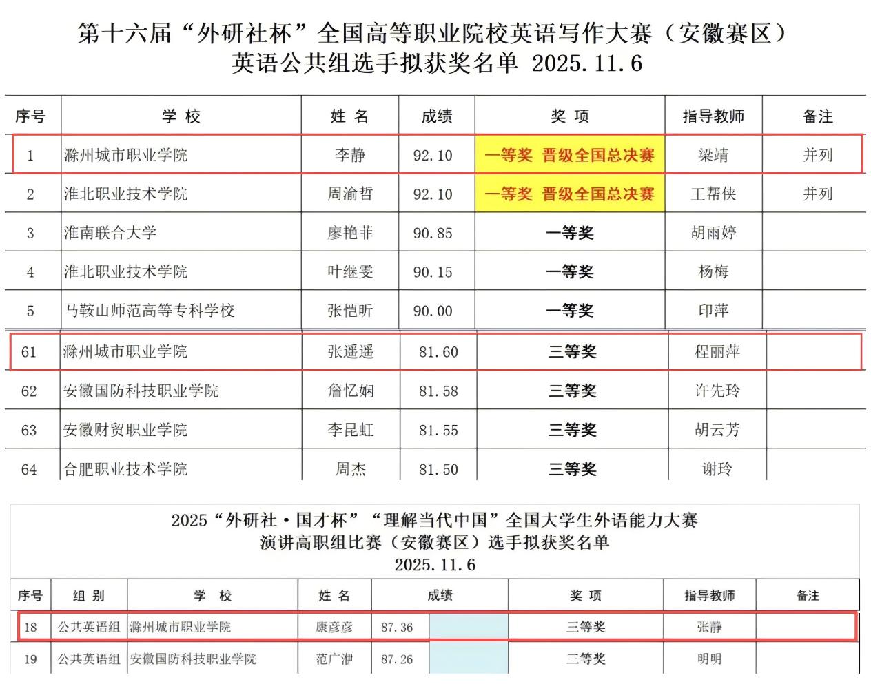 近日,第十六届“外研社杯”全国高等职业院校英语写作大赛与演讲大赛(安徽赛区)赛事相继落下帷幕。我校师生在两项赛事中表现亮眼,共获3项省级奖项。其中,梁靖老师指导的学生李静(教育学院)勇夺写作大赛公共英语组并列第一名暨省一等奖,成功晋级全国总决赛,实现我校在该赛事中的又一突破。程丽萍、张静两位老师指导的学生张遥遥(医学院)、康彦彦(教育学院)分获写作、演讲大赛省级三等奖。