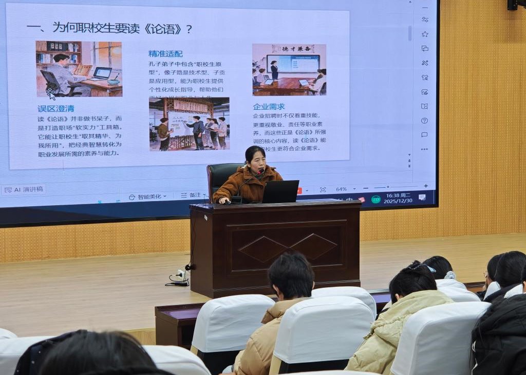 周老师从“为何职校生要读《论语》”入手,打破“读经典等于做书呆子”的刻板印象,强调《论语》有助于打造职场“软实力”,提升敬业、责任等企业看重的职业素养。她通过孔子弟子中的“职校生原型”——如技术型的子路、应用型的子贡,说明经典智慧同样适配现代职校生的成长路径。 在讲解《论语》中的职业观时,周老师重点阐述了“执事敬”的敬业精神、“知之者不如好之者”的乐业心态、“君子不器”的成长理念,生动展现了如何将经典理念转化为职业发展的内在动力。针对处世之道,周老师以“己所不欲,勿施于人”“讷于言,敏于行”“君子和而不同”为核心,引导学生学会换位思考、踏实做事、团队协作,提升职场与生活中的沟通与协作能力。