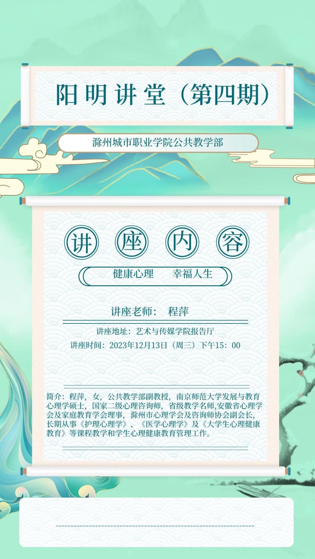 程萍,女,公共教学部副教授,南京师范大学发展与教育心理学硕士,国家二级心理咨询师,省级教学名师,安徽省心理学会及家庭教育学会理事,滁州市心理学会及咨询师协会副会长,长期从事《护理心理学》、《医学心理学》及《大学生心理健康教育》等课程教学和学生心理健康教育管理工作。