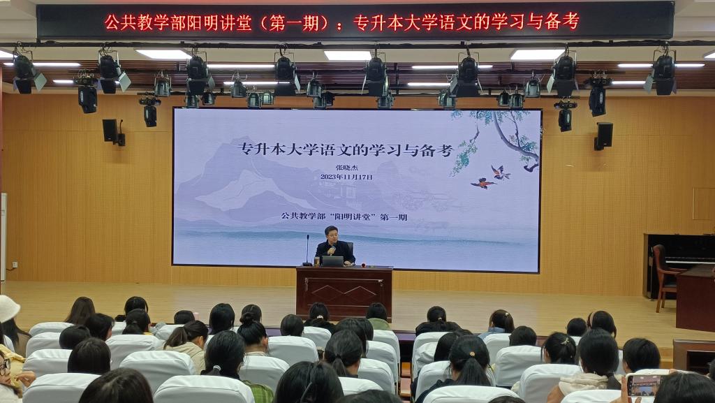 开设“阳明讲堂”,提升赋能“成色”。为贯彻落实学校深化“五育”建设有关会议精神,充分发挥党员的先锋模范作用,提升公共课教师赋能学校建设发展的能力水平,公共教学部发动所属教师,推动副高级以上教师全覆盖,组织开展“阳明讲堂”特色系列讲座活动。第一期“专升本大学语文的学习与备考”,指导学生专升本备考经验。第二期“‘滁州四亭’的文学文化价值”,邀请滁州职业技术学院专家与师生共同探讨欧阳修的文学遗产及其文化价值。第三期“大学英语B级考试备考指南及答题技巧”,为考级同学加油助力。迄今为止,“阳明讲堂”已开展七期,讲堂座无虚席,活动力度大,参与面广,互动性强,总参与量达到3000余人次。内容丰富,涵盖广泛,在传统文化、地域文化、名家名作、心理健康等方面均有涉猎,传承了中华优秀传统文化,普及了文化常识、心理健康知识,促进学生思想道德水平提高,推动学生职业能力健康发展。