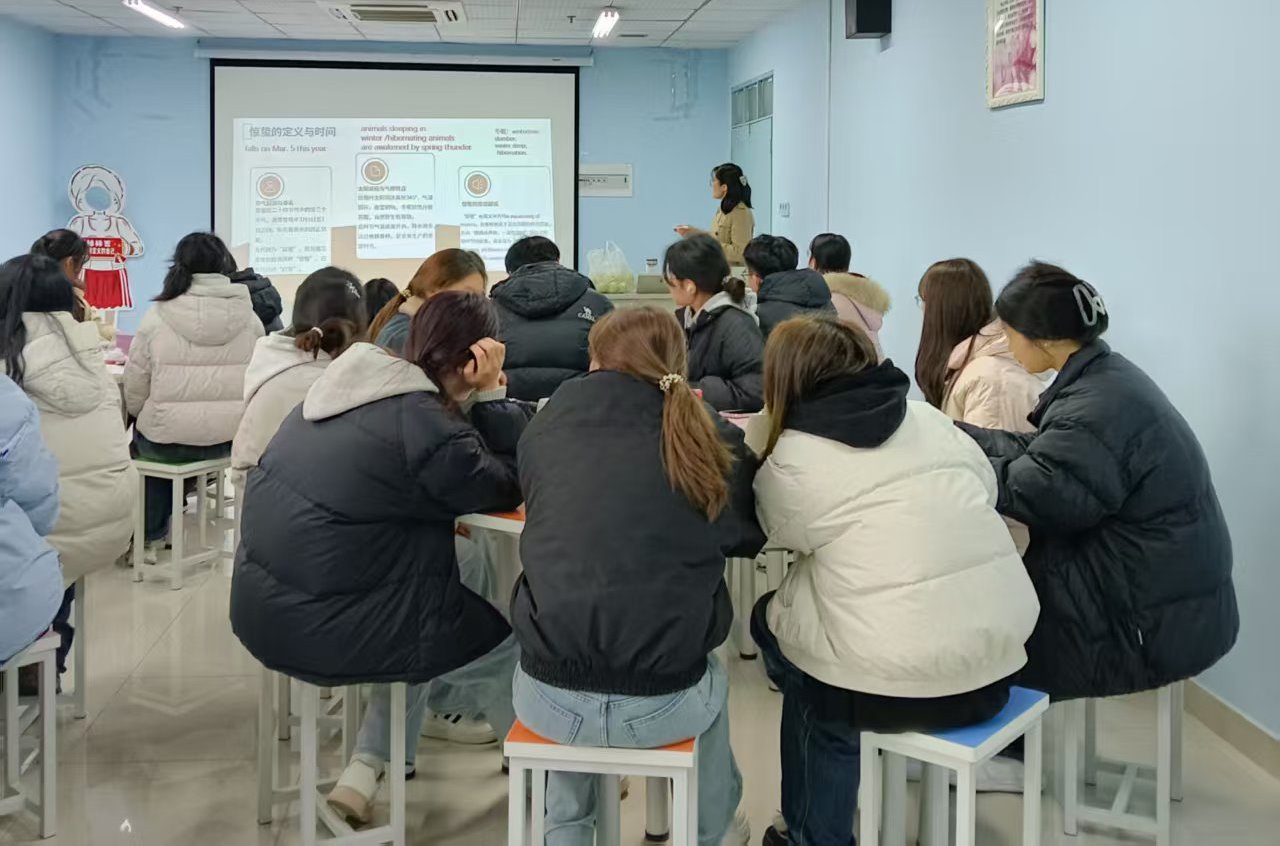 本次活动由张晓慧老师主讲,张老师从惊蛰节气的起源、命名、文化内涵入手,结合物候现象、天文历法等科学知识,深入浅出地为同学们讲解了惊蛰的历史渊源与现实意义,特别介绍了与惊蛰相关的传统农谚及其在现代农业中的应用价值,生动讲述了祭白虎、吃梨、打小人等民俗活动的文化背景,并教授了这些习俗的英文表达,帮助同学们在提升英语能力的同时,加深对中国优秀传统文化的理解。