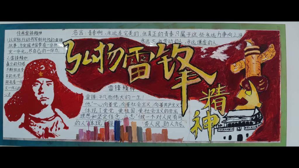 为弘扬和宣传雷锋精神,我院团总支组织开展了 “传承红色基因,弘扬雷锋精神”主题板报评选活动。各班同学利用业余时间、查找资料、精心策划、分工合作以图文并茂、设计新颖的形式在黑板上展示了“传承红色基因,弘扬雷锋精神”等宣传内容。其中包括追述雷锋同志的光辉事迹,或阐释雷锋精神的时代内涵,或号召大家向雷锋同志学习。每一份作品都透露着学生对雷锋精神的理解,崇尚和学习的热情、决心。