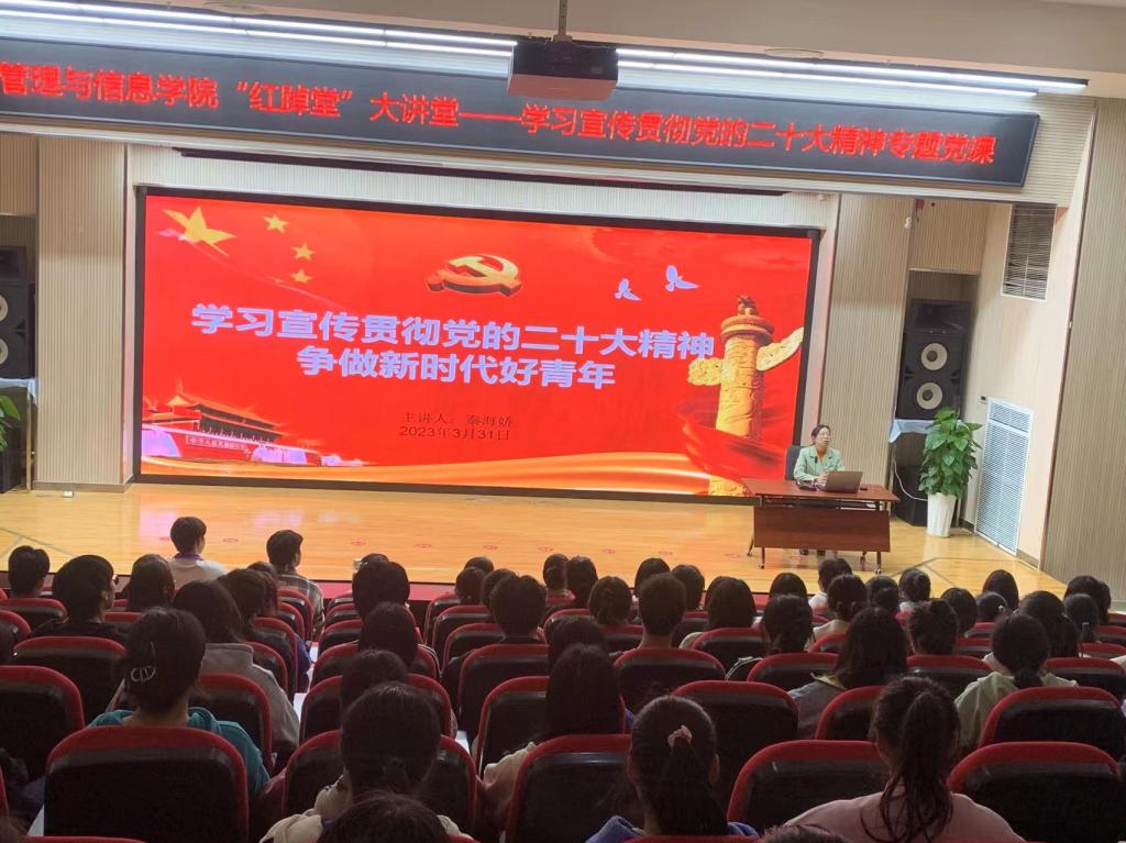 3月31日下午,管理与信息学院党总支副书记秦海娇在学院图文中心四楼报告厅以“学习宣传贯彻党的二十大精神,争做新时代好青年”为题,为学院2023年确定的211名入党积极分子上了一堂专题党课。