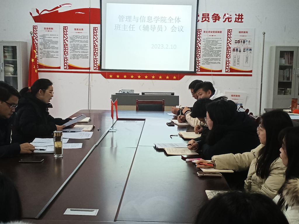 为进一步做好新学期学生管理工作,管理与信息学院2月10日上午在院会议室召开了辅导员(班主任)工作会议,院党总支书记陈兴旺、学管人员以及全体辅导员(班主任)参加会议,会议由学院党总支副书记秦海娇主持。