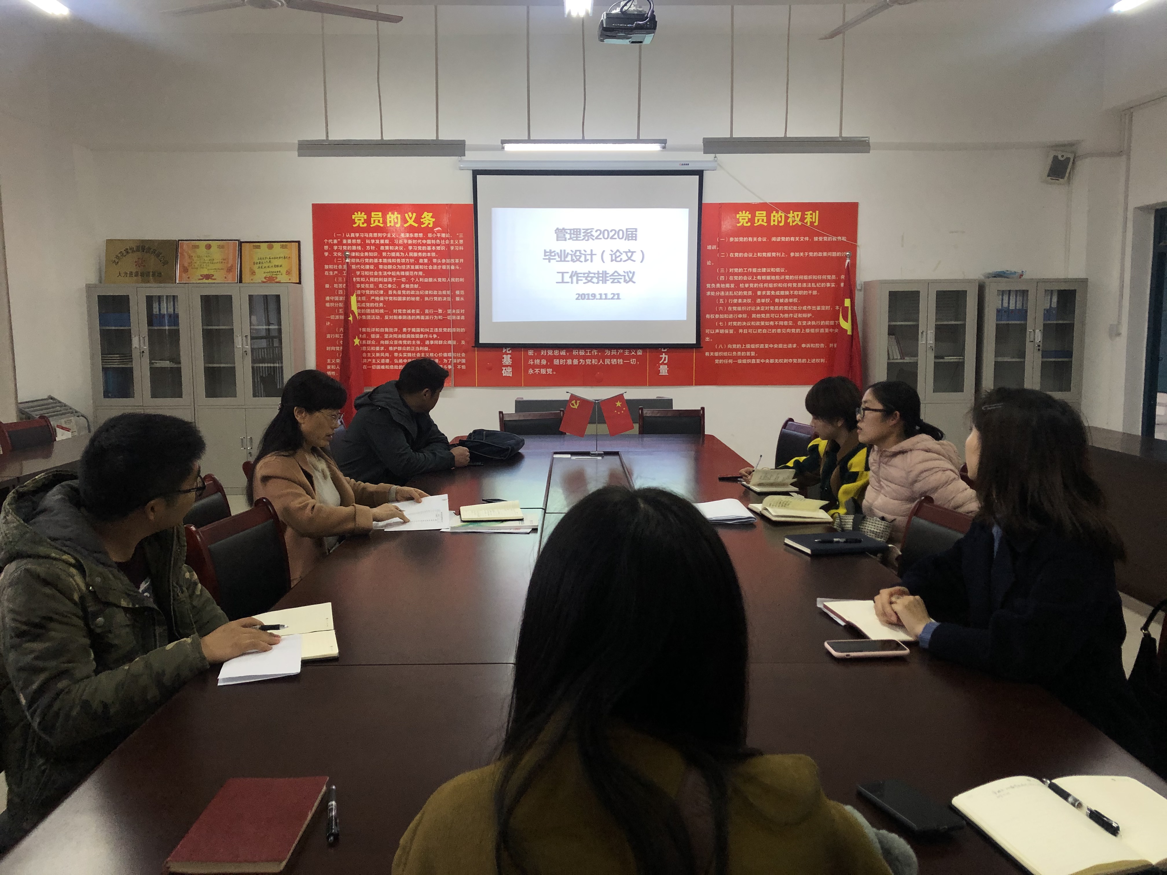 11月21日下午,管理系在2202会议室召开了2020届毕业设计(论文)工作安排会议,会议由陈素霞主持,即将开展毕业设计(论文)指导的相关老师参加了此次会议。