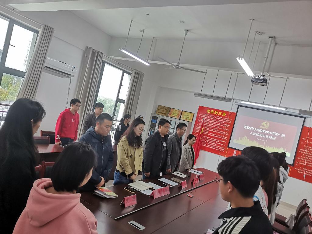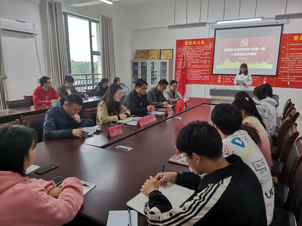 4月21日下午,管理系分党校于系党员活动室举行管理系2021年第一期入党积极分子培训开班仪式暨培训第一讲,管理系党总支支委委员、第一期培训学员参加,会议由系党总支青年委员杨静怡主持。