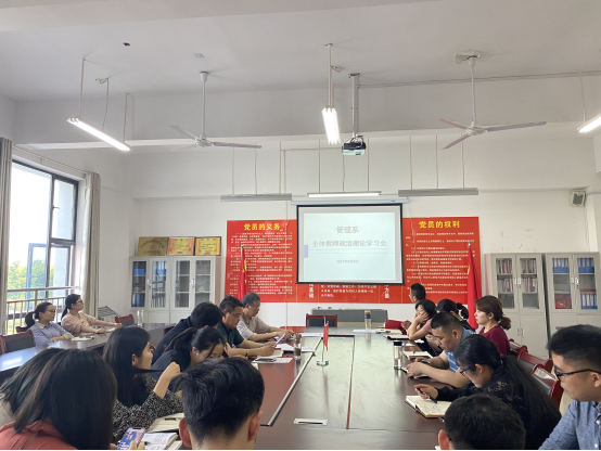 2021年5月8日下午,管理系在系会议室召开全体教师工作会议暨思想政治理论学习会,会议由管理系党总支书记陈兴旺主持。