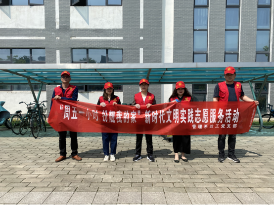 2021年5月21日上午,管理系党总支所辖学生党支部和教工党支部分别在丰乐社区和学院内开展“周五一小时 扮靓我的家”新时代文明志愿服务活动。