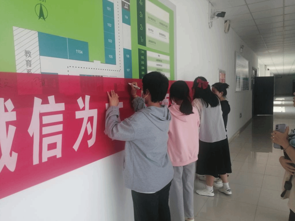5月20日下午管理与信息学院组织在校学生在C1楼大厅举办了诚信签字和宣讲活动。在校班级共计300余人参加此次活动。与此同时在C1-1103召开了20级生源地信用助学贷款毕业生诚信教育座谈会,了解国家的资助政策和生源地信用贷款办理条件和注意事项,19级部分学生在线上聆听了会议精神。