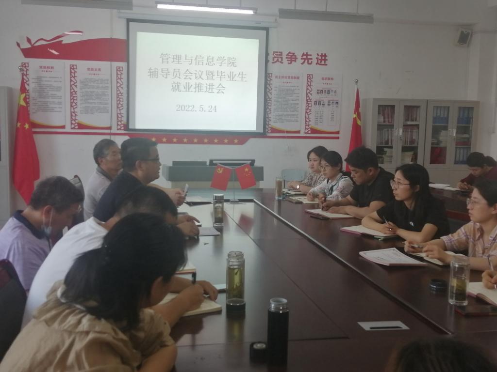 为进一步做好学生管理工作,在学期结束考试准备阶段和就业工作关键阶段,管理与信息学院于5月24日下午在院会议室召开全体辅导员(班主任)工作会议,院党总支书记陈兴旺、学管秘书唐静、团总支书记杨静怡以及在校班级辅导员(班主任)、2022届毕业班班主任参加会议,会议由陈兴旺主持。
