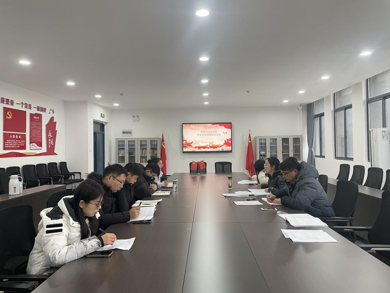根据学校《关于召开主题教育专题组织生活会和开展民主评议党员工作的通知》要求,管理与信息学院学生党支部于2024年1月22日下午在党员活动室召开了主题教育专题组织生活会暨民主评议党员大会。管理与信息学院党总支书记陈兴旺以普通党员的身份参加了会议并作点评,会议由支部书记秦海娇主持。