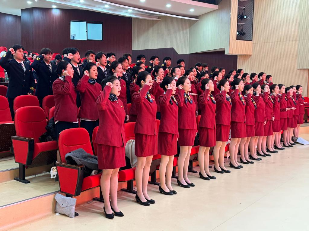 制服的着装规范介绍完毕,全体空中乘务专业学生整装肃立,在23级老生的带领下,高举右手进行庄严的宣誓,承诺为民航事业贡献自己的智慧与力量。
