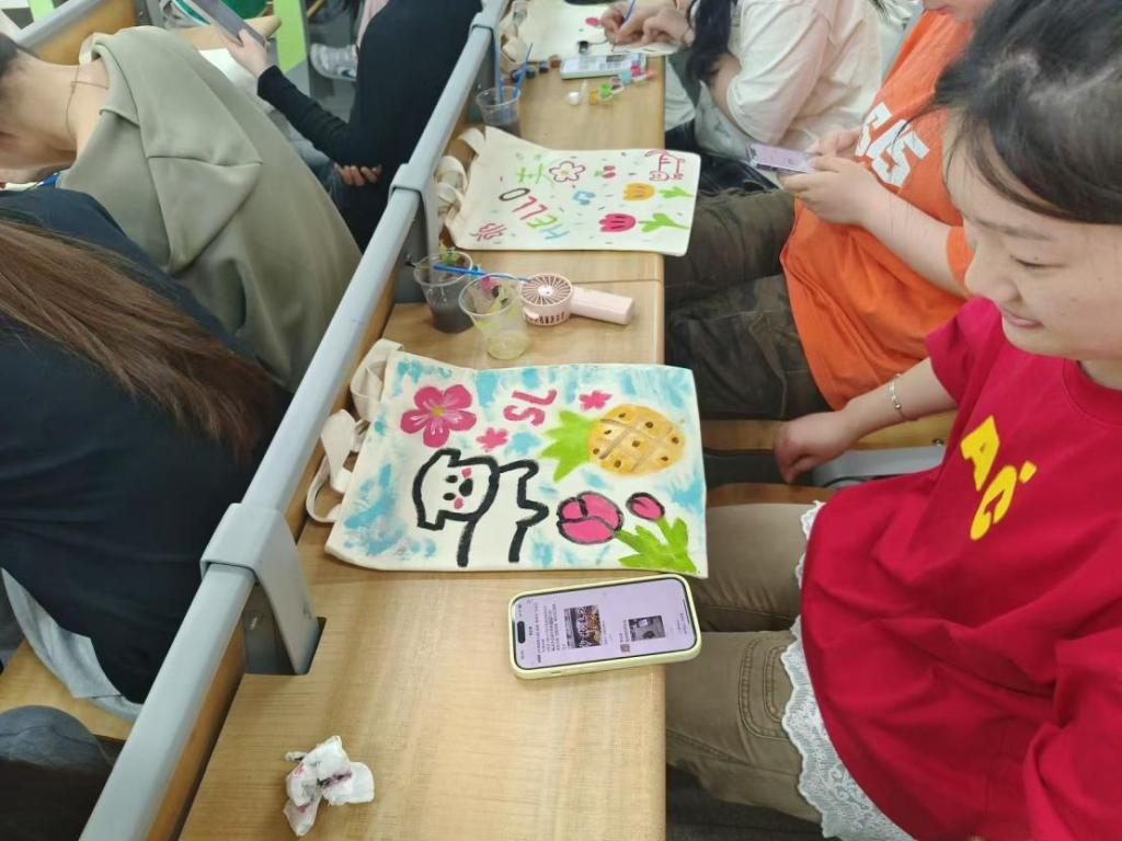 活动现场,各类DIY项目以及“你划我猜”小游戏吸引了众多同学的目光。在帆布包DIY区,同学们挥洒创意,用五颜六色的颜料在帆布包上绘制出独一无二的图案,每一件作品都体现了同学们的个性和审美。