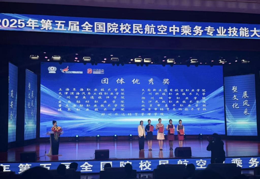 2025年12月19日,第五届全国院校民航空中乘务专业技能大赛总决赛在河北唐山曹妃甸职业技术学院圆满落幕。我校空中乘务专业参赛团队凭借扎实的专业素养与默契协作,荣获团体优秀奖,展现了新时代民航学子的青春风貌与专业实力。