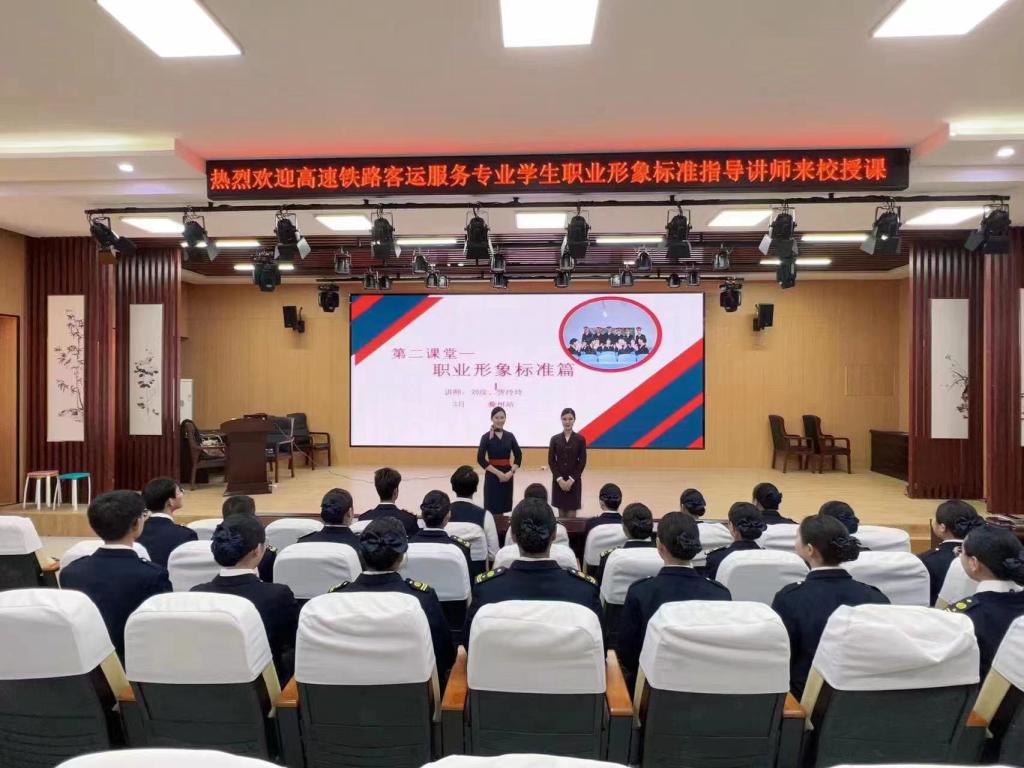 訾玲玲、刘纹两位老师为高速铁路客运服务专业学生开设了职业形象标准讲座。訾玲玲老师通过大量图片、文字、实例对高速铁路客运服务行业工作中应遵循的各项礼仪规范、职业形象标准等进行了细致讲解。