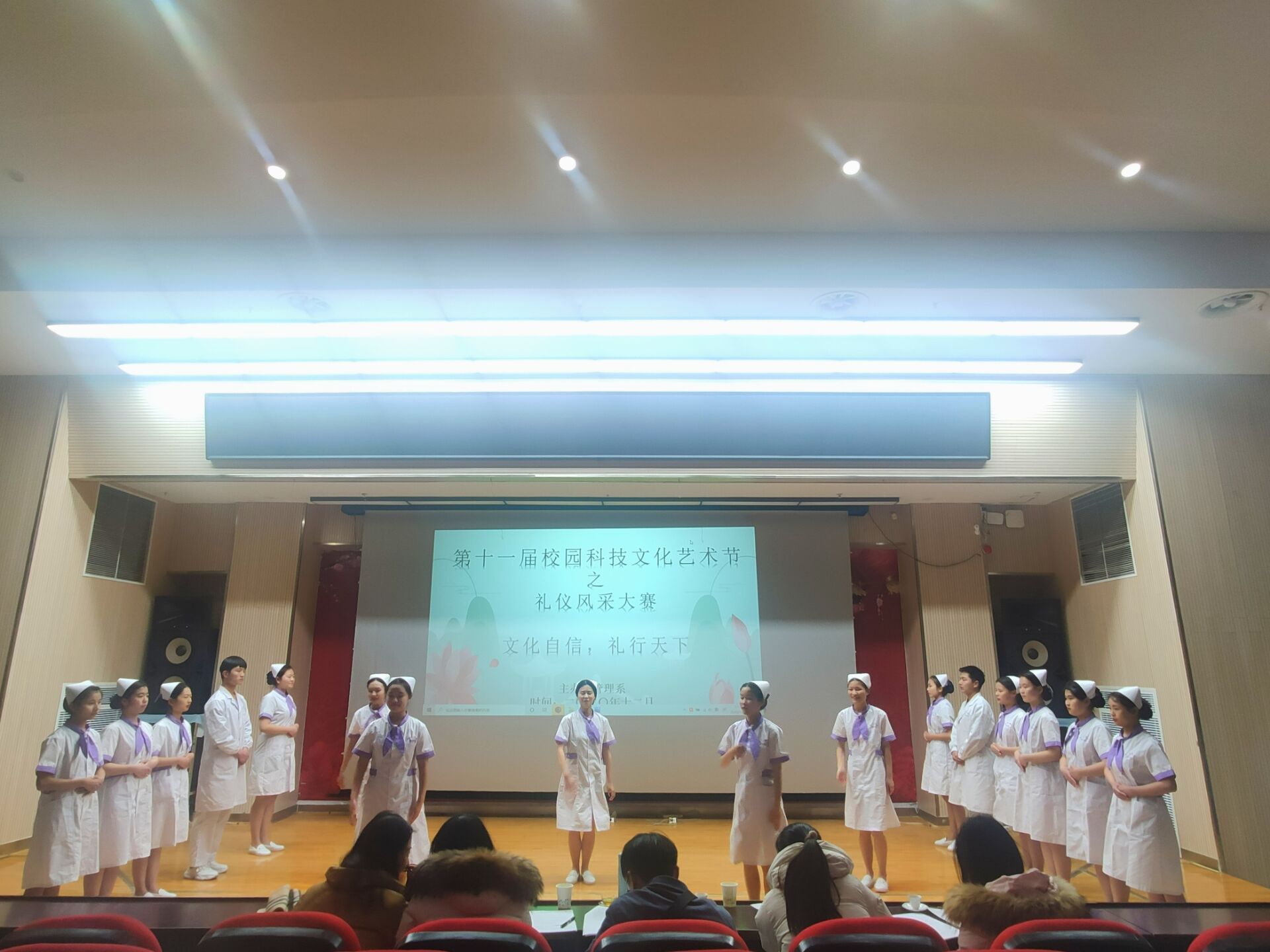为弘扬中华文明礼仪,传承和发扬优秀文化传统,宣传推广文礼仪知识,丰富大学校园文化,展现我院学子风采,12月14日管理系成功举办第十一届校园科技文化艺术节之“文化自信,礼仪天下”礼仪风采大赛。比赛评委由管理系刘蓉、艺术系谢添、医学系张和、护理系李亚云和教育系肖炀担任,全校代表共150人出席并观看了比赛。