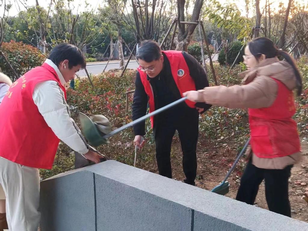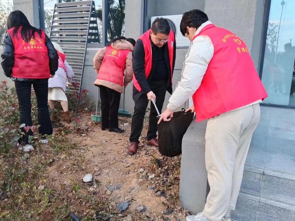 活动中,党员教师和学生入党积极分子身着红色志愿者马甲,三五人一组分头行动,齐心协力、相互配合,有的拿着扫把和簸箕清理步道枯叶,有的用垃圾夹深入绿化带清理卫生死角杂物......大家干劲十足,充分发扬不怕苦,不怕累的精神。