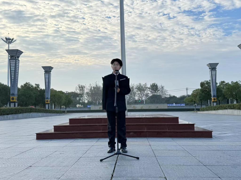 22级数据高专4班张康同学作国旗下的讲话,他号召同学们在实现中华民族伟大复兴的征程中勇于奉献青春,奉献自我,同时刻苦学习知识,坚定理想信念,以实际行动诠释着对祖国的拳拳之情,争做新时代优秀追梦青年。
