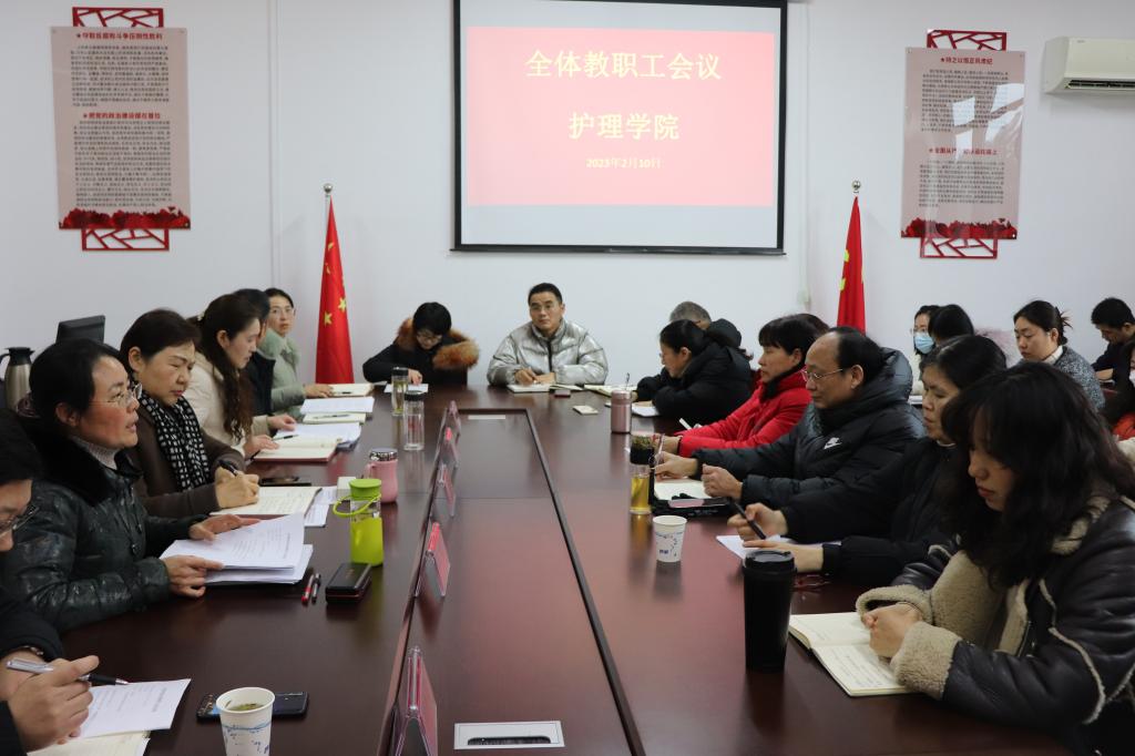 齐心协力谋发展,凝心聚力促和谐。2月10号下午,护理学院在B3-106召开全体教职工大会,校党委书记张志华,护理学院党总支书记蔡季秋,护理学院院长金虹及全体教师参加会议,会议由蔡季秋主持。