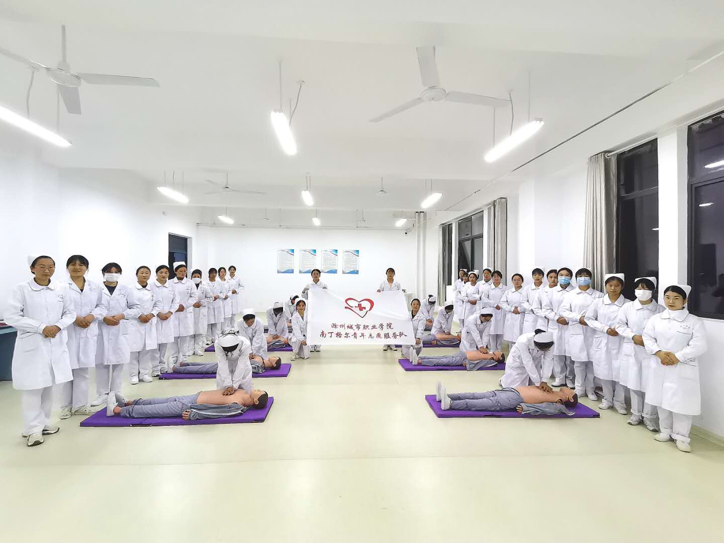 卢老师为学生讲解了心肺复苏、海姆立克急救法的基本技能,并进行了实践操作方面的培训。急救队队长、安徽省护理技能大赛二等奖获得者丁带娣、孙颖为同学做了获奖成果展示。同学们在模拟人上练习心脏复苏操作,大家热情高涨,边听边记,表现出了极大的兴趣。