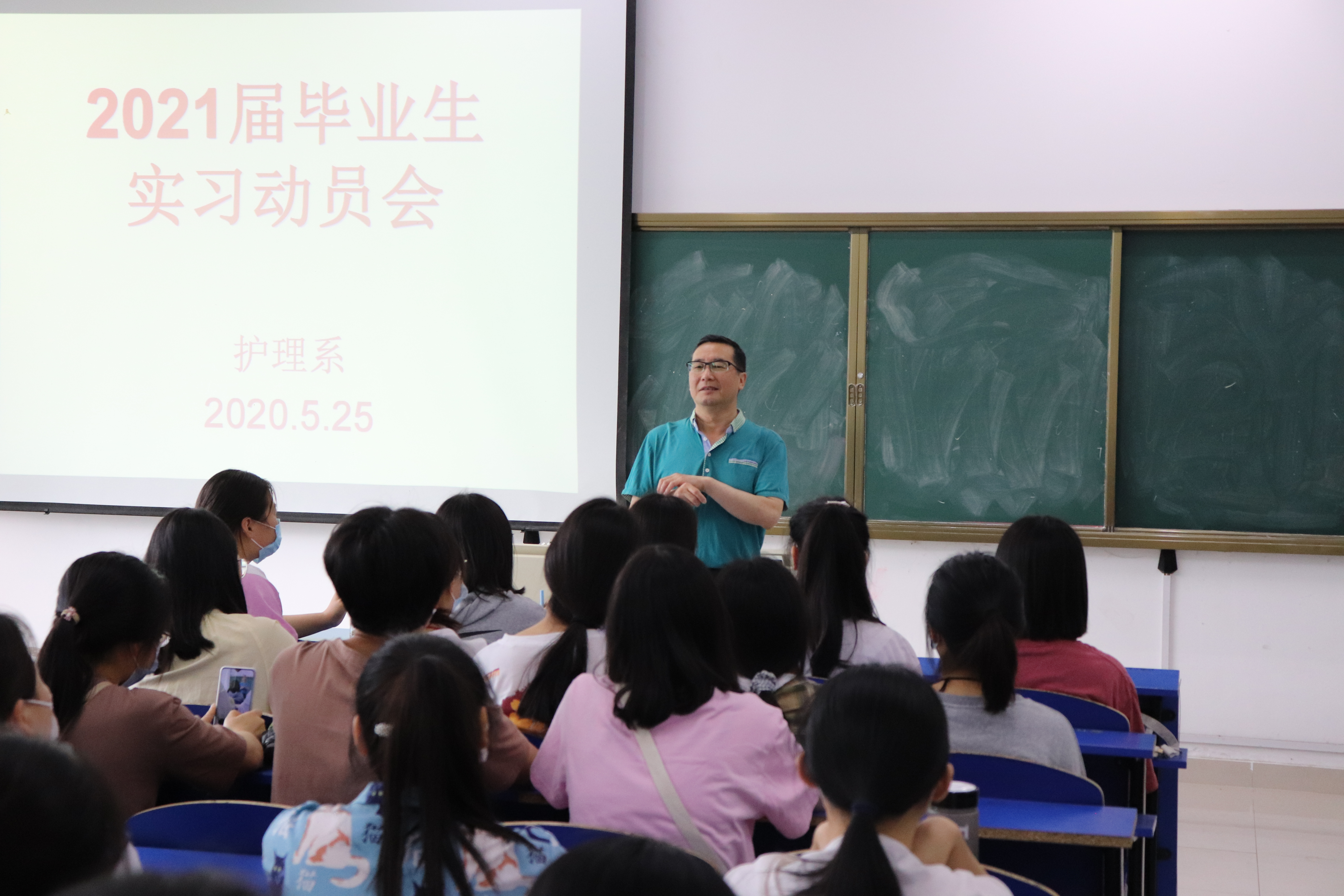 2020年5月25日上午,护理系在B1教学楼举行了实习动员大会。系主任章正福、系党总支书记蔡季秋出席会议并讲话,护理系2021届毕业班级全体同学、系部学管老师及辅导员参加了动员大会。