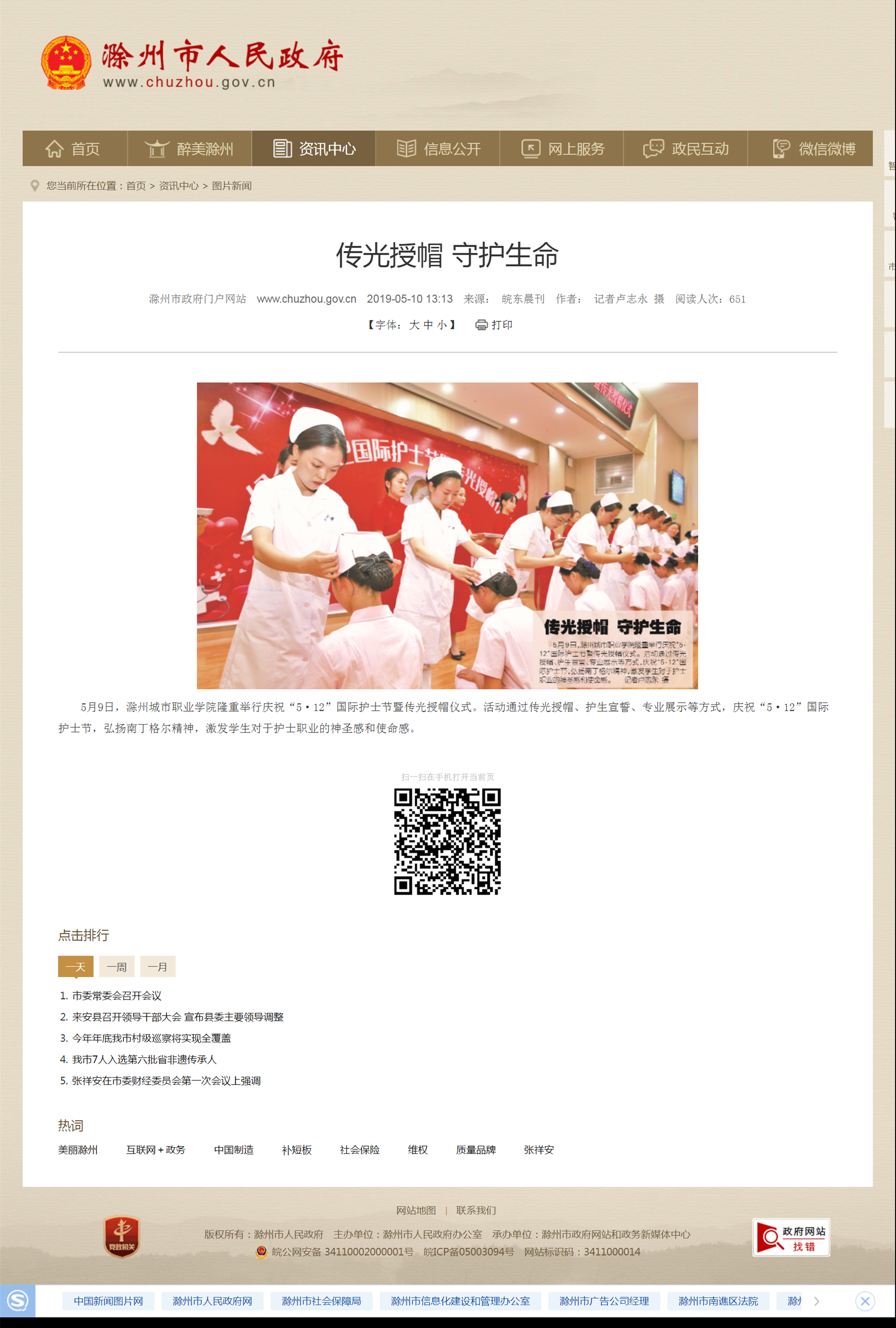5月9日,护理系隆重举行纪念5·12国际护士节暨传光授帽仪式,滁州市电视台、晥东晨刊等媒体记者闻讯前来报道本次活动。记者们感受了传光授帽仪式的隆重、圣洁和庄严,他们迫不及待地发出消息。仪式后几天,活动新闻报道见诸报端、电视台与网络。安徽青年报、晥东晨刊刊发在报纸的头版显要位置,安徽教育厅官网、滁州市委市政府门户网站等媒体图文并茂宣传报道活动,宣传效果明显,点击率很高。
