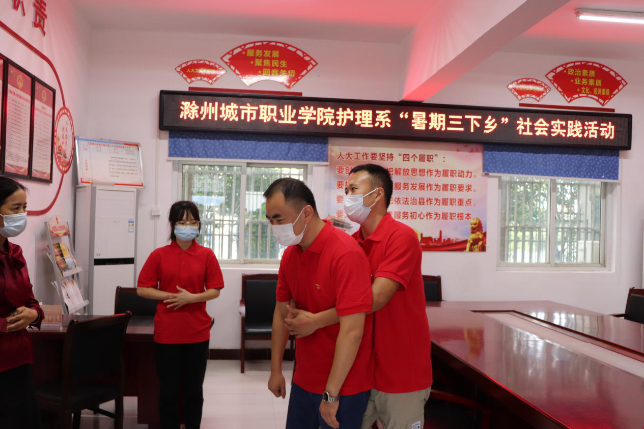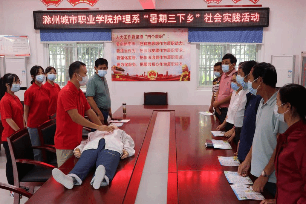 为助力乡村振兴,丰富大学生的暑期生活,提升大学生服务意识,进一步提高广大群众的防灾避险、自救互救能力,滁州城市职业学院护理系大学生暑期“三下乡”社会实践团队在全椒县大墅镇开展了“急救知识我普及”宣传培训活动。