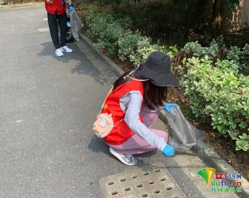 图片为志愿者在马路边进行捡取垃圾的工作。中国青年网通讯员 张乐如 摄