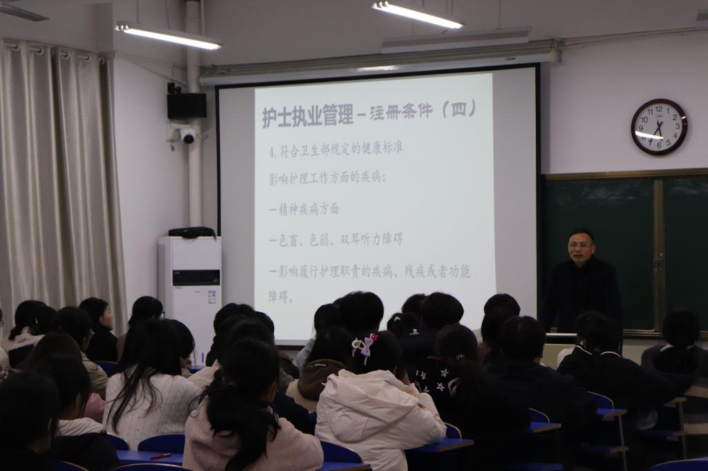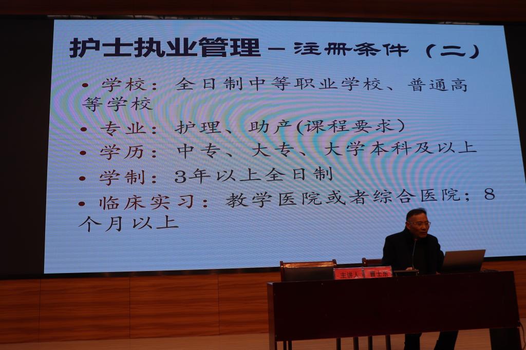 讲座中,曹校长从宪法知识简介入手,通过历届国家“宪法日”主题,让同学们了解《宪法》,通过对各种法律条文的解读帮助广大师生更全面地了解法律常识、树立法制观念,引导广大师生运用法律思维处理问题,使广大师生受益匪浅。接着结合《护士条例》和护士资格证考试的真题,为同学们解释了相关条例的运用,生动形象地向同学们普及了相关条例知识。最后从深刻认识习近平法治思想的重大意义、准确把握习近平法治思想的核心要义和全面掌握习近平法治思想的科学方法三个角度入手,帮助师生学习贯彻习近平法治思想。