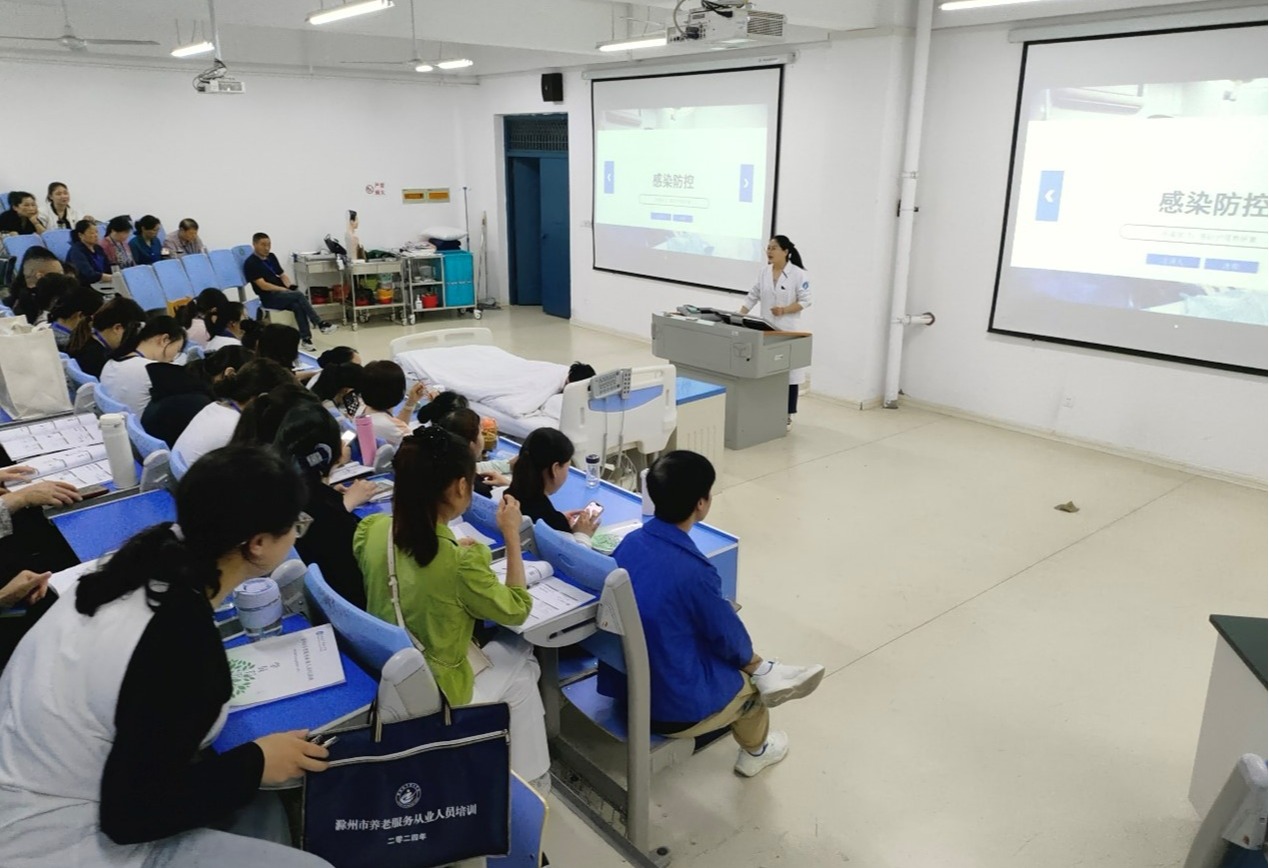 为进一步提升全市养老服务护理人员综合素质,满足老年人多样化、专业化养老服务需求,打造一支德技兼备的养老服务人才队伍。由滁州市民政局、滁州市人力资源和社会保障局主办、滁州城市职业学院承办的2024年度全市养老服务护理员培训班,于2024年5月20日在我校护理学院举办了开班仪式。民政局养老服务科科长钱尼兵做了开班动员报告,护理学院副院长左晶晶强调了培训班的学习和纪律要求。
