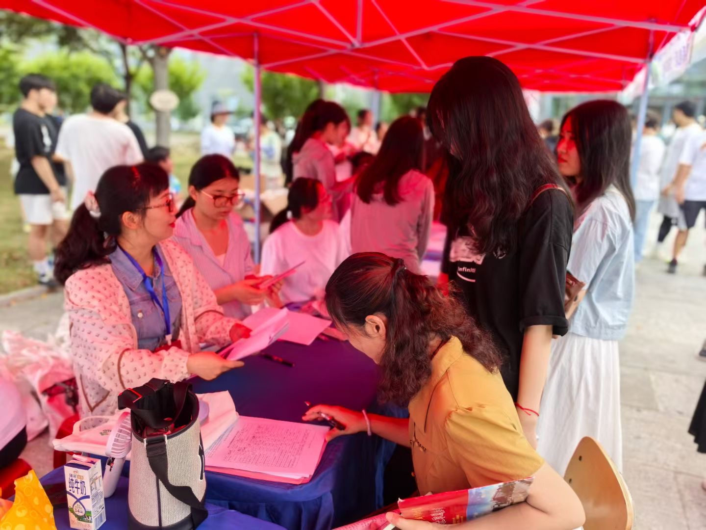 在迎新的师生中,志愿者的身影无处不在,他们及时与入校新生对接,全力新生入校手续办理、心理疏导、困难帮扶等工作,充分发挥学生志愿者战斗堡垒作用和先锋模范作用。志愿者们接过重重的行李,全程“一对一”陪伴新生报到各个环节,在报到点等候的师生细心地为新生办理好报到的相关手续,贴心的服务,让初来乍到的萌新倍感温暖。