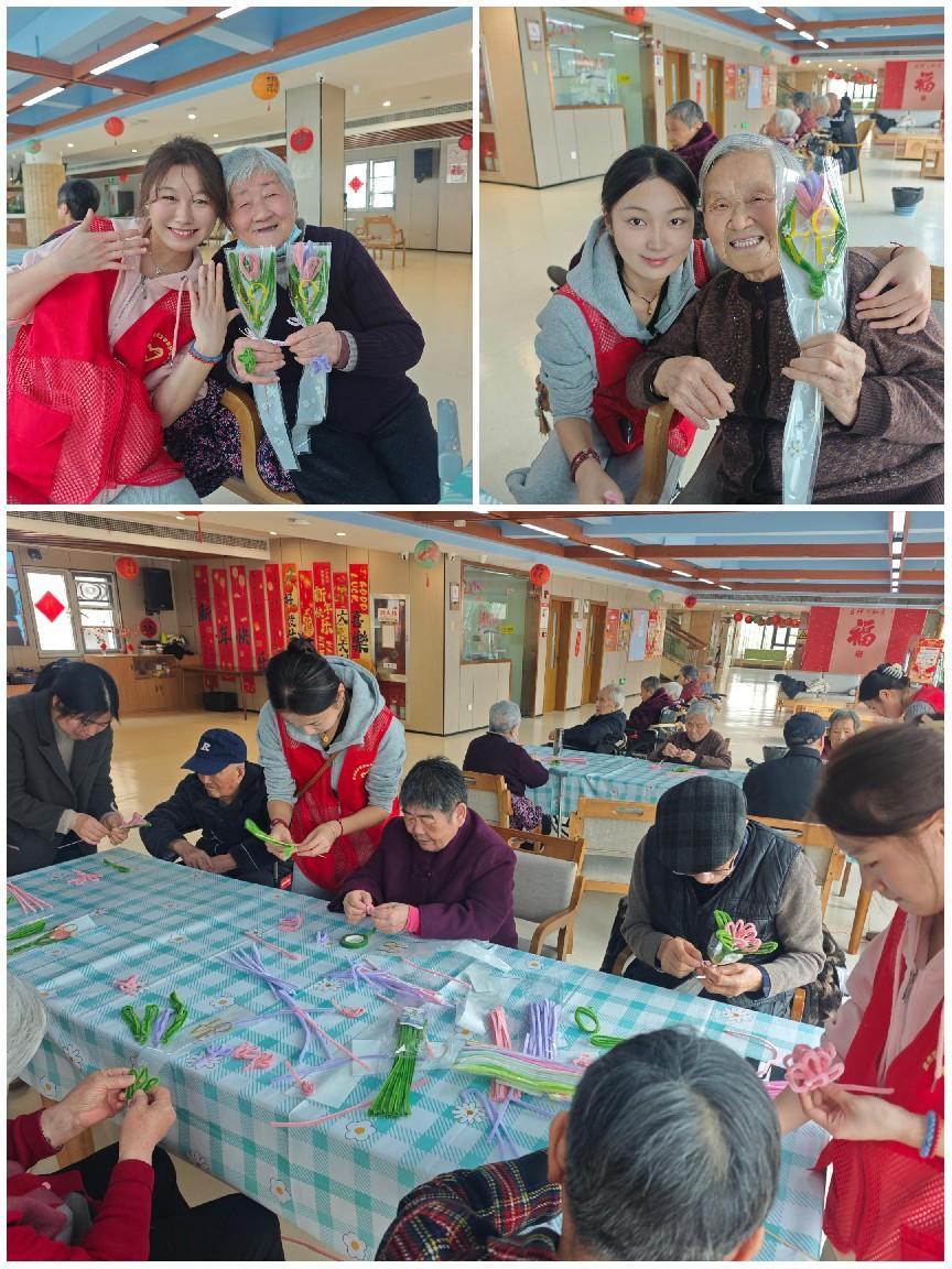 文艺表演结束后,同学们分组与老人们互动,手把手教他们制作手工丝网花。从裁剪、塑形到组装,同学们耐心讲解步骤,老人们兴致勃勃地参与其中。一朵朵色彩鲜艳的手工花在欢声笑语中绽放,既锻炼了老人的动手能力,也搭建起跨越年龄的情感桥梁。活动最后,同学们将手工花赠予老人,并送上亲手绘制的健康知识卡片,将专业所学融入暖心服务。