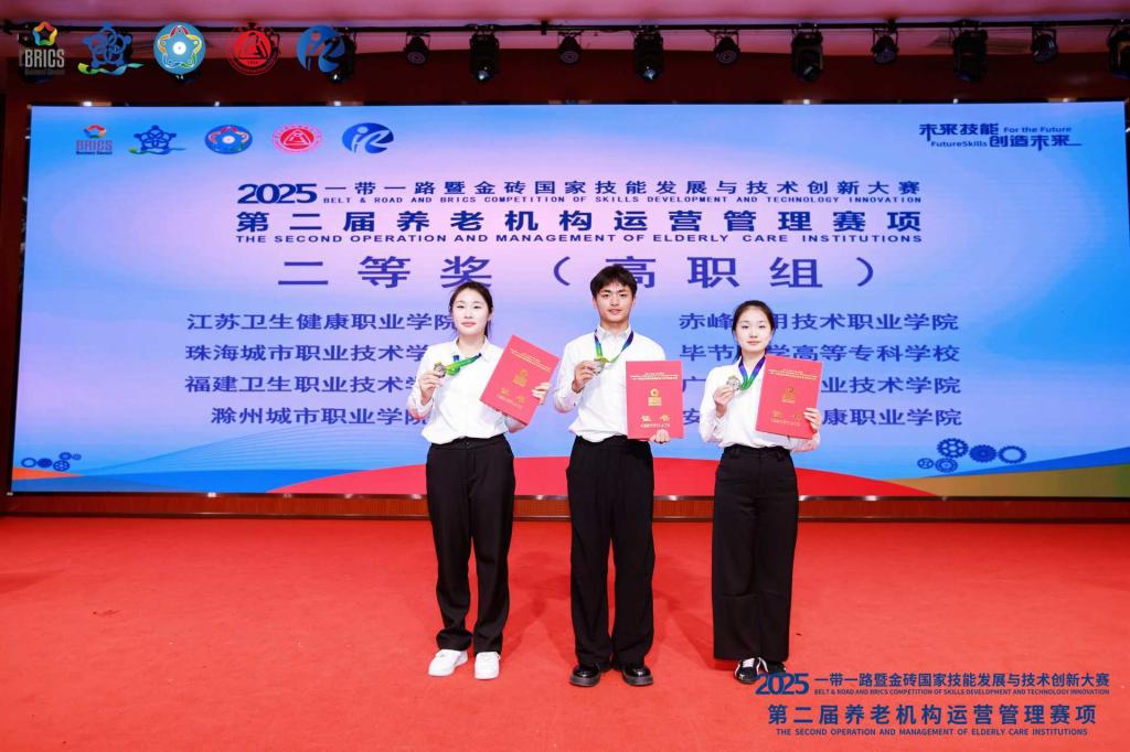 近日,2025 “一带一路” 暨金砖国家技能发展与技术创新大赛第二届养老机构运营管理赛项全国总决赛在重庆工贸职业技术学院圆满落幕。经过两天的激烈角逐,由我校刘娜、郝成雅、张新盟组成的代表队,在指导教师王艳、王京的带领下,从全国13个省份的精锐队伍中脱颖而出,荣获全国总决赛二等奖,指导教师同步获评 “优秀指导教师奖”,实现养老运营管理领域国家级赛事的重要突破。