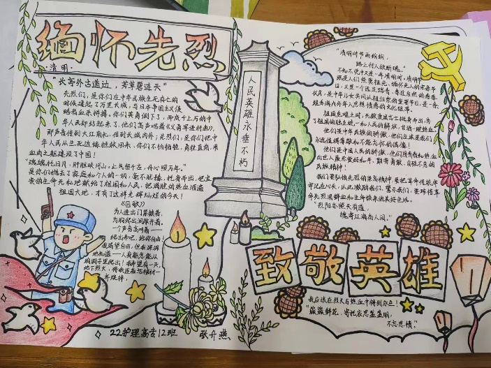 英雄之名,重逾千钧。为更好学习宣传贯彻党的二十大精神和习近平总书记关于崇尚英雄、缅怀英烈的重要论述,以及习近平总书记在十四届全国人大一次会议上关于双拥工作的重要指示,弘扬拥政爱民、拥军优属光荣传统,巩固发展新时代军政军民团结,深刻感悟习近平总书记的英烈情怀,深切缅怀为民族独立解放、国家繁荣富强做出奉献和牺牲的英雄先烈们。护理学院团总支组织开展“传承红色血脉,奋进新征程”系列主题团日活动。通过诵读英雄家书、讲述“心中的英雄”、制作手抄报以及致敬革命烈士等多种形式的主题活动,深刻表达了对革命烈士崇高的敬意和真切的缅怀。