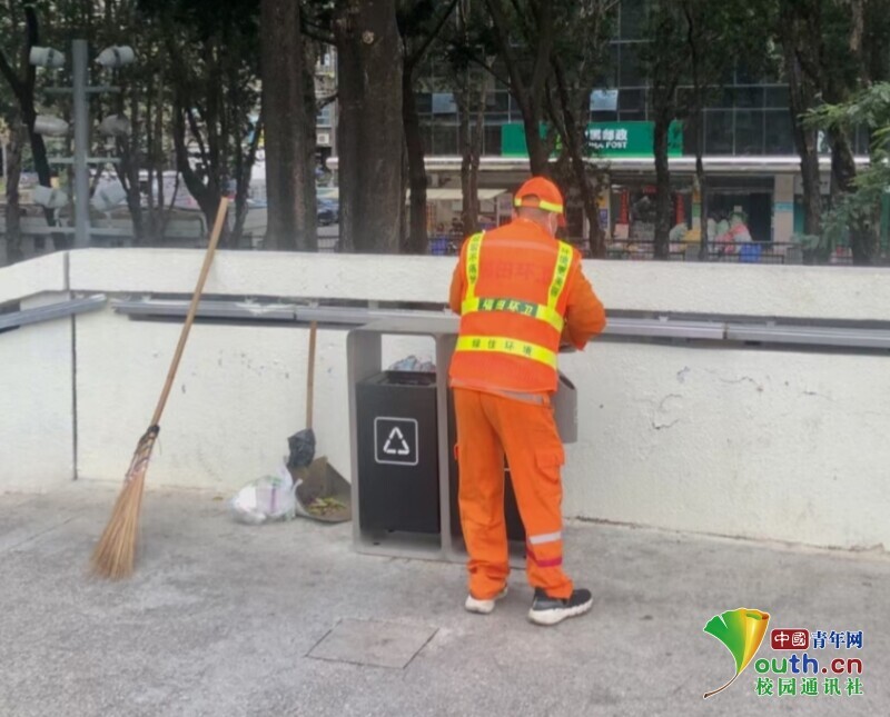 图片为志愿者帮忙捡取塑料垃圾瓶并给予放置垃圾桶里。 中国青年网通讯员 张乐如 摄