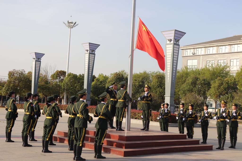 英姿飒爽的校国旗护卫队身着戎装,迈着整齐有力的步伐,护卫着鲜艳的五星红旗入场。伴着激昂雄壮的《义勇军进行曲》,国旗缓缓升起,在晨曦中迎风飘扬。