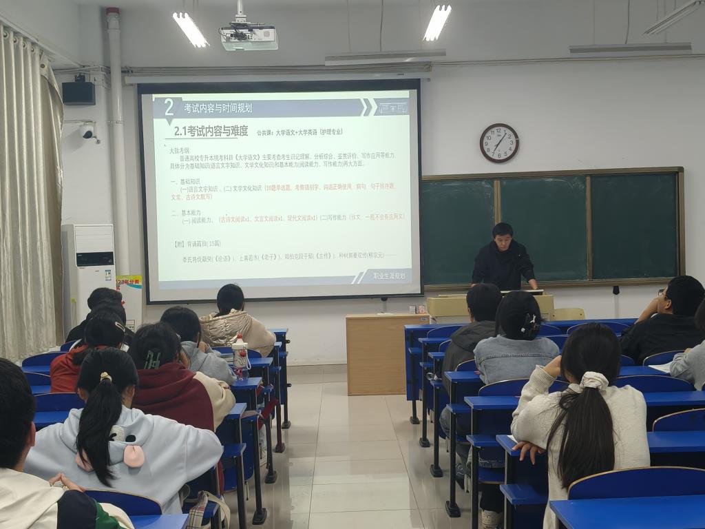 苏欣学姐以自身在南京东部战区总医院的实习经历为切入点,分享了兼顾实习与学习的实用方法——在科室空闲时用小本本背诵单词和专业知识点,实习结束后全身心投入集中复习,这些接地气的技巧让在场同学深受启发。崇玉成学长作为退伍军人,不仅讲述了军队生活中磨炼出的坚毅意志对备考的助力,还详细解读了安徽省专升本针对退伍军人的专项招生政策,为有相关背景的同学提供了宝贵的政策参考。