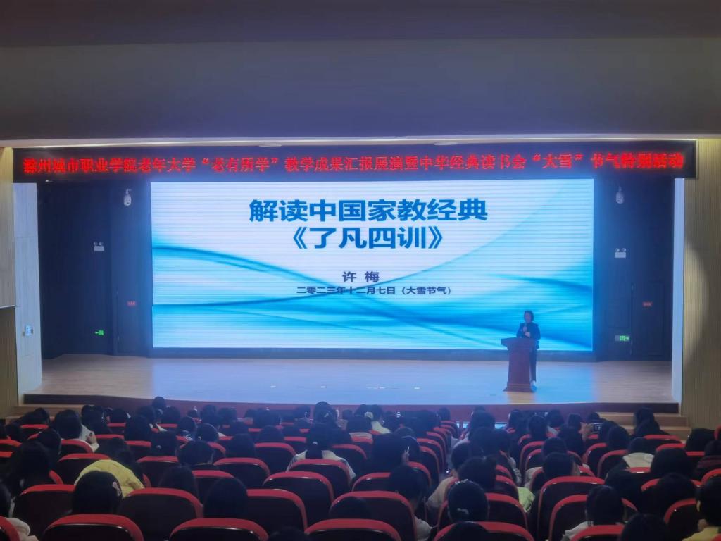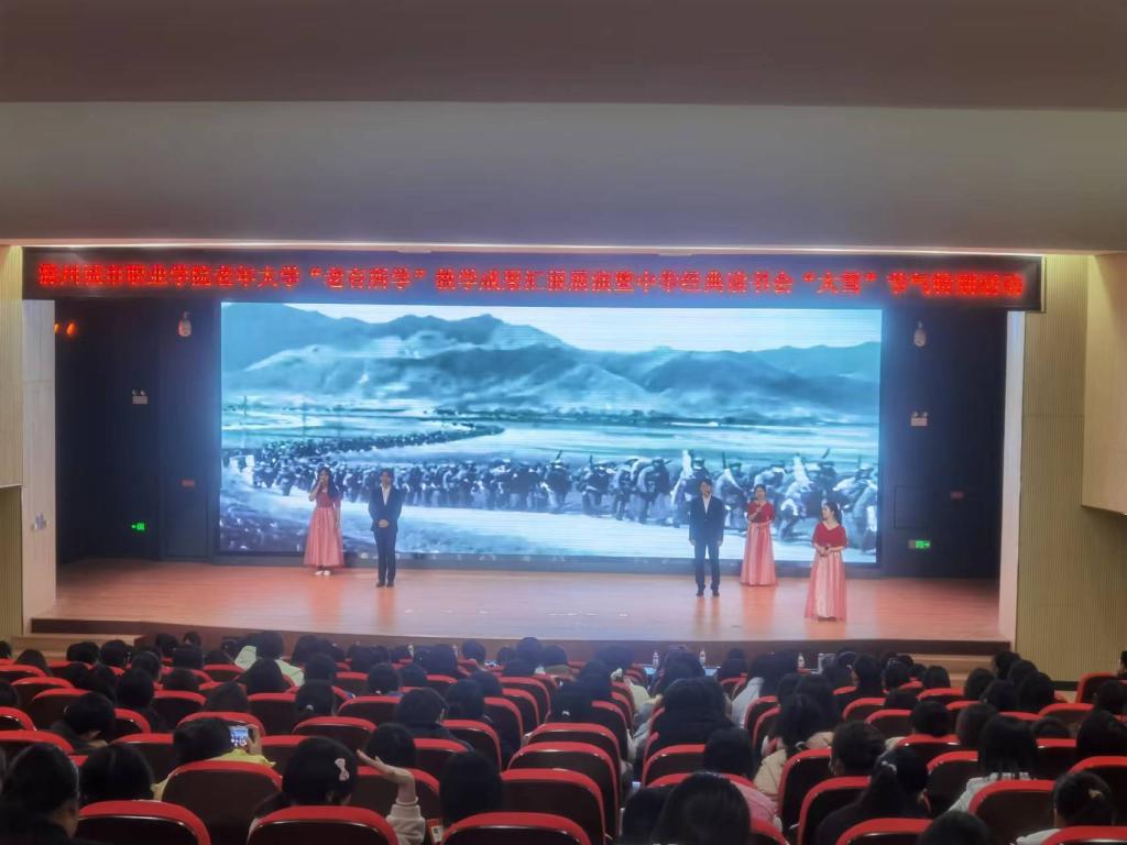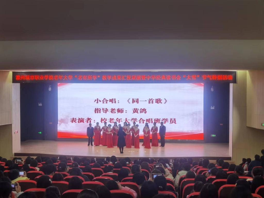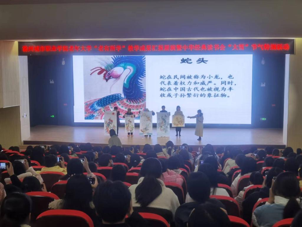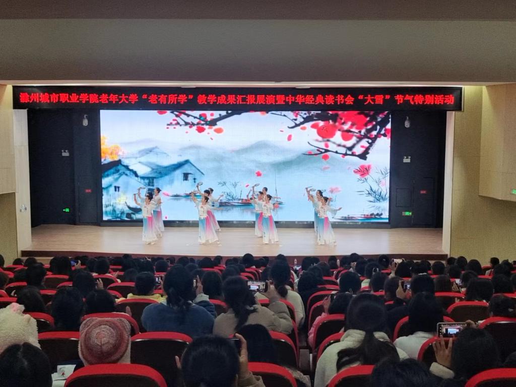 为充分展示我校老年大学学员风采,同时弘扬中华优秀传统文化,推进“书香校园”建设,培养青年学生的阅读习惯,在学校形成爱读书、读好书、想读书的浓厚氛围,12月7日下午,在我国传统的二十四节气—“大雪”节气来临之际,宣传统战部、继续教育学院、团委共同举办校老年大学“老有所学”教学成果汇报展演暨中华经典读书会“大雪”节气特别活动。校党委委员、校老年大学校长施向阳,校党委委员、宣传统战部部长陈通,校老年大学常务副校长、继续教育学院院长许梅,团委书记陈婷婷以及中华经典读书会近400名会员参加了活动。