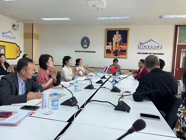 在泰国玛哈沙拉堪皇家大学(Rajabhat Mahasarakham University),访问团一行受到了热情接待,玛哈沙拉堪皇家大学校长Dr Natchanok Jansawang等14名领导参加交流座谈会。座谈会上,双方明确了学前教育专业联合办学的人才培养方案,商讨建立“鲁班工坊”相关事宜,签订了学前教育专业中外合作办学协议,举行了“海外文化研修中心”挂牌仪式。玛哈沙拉堪皇家大学表示希望与中国的高校多开展交流合作,同时希望两校以设立“海外文化研修中心”为契机,把更多的中国的优秀传统文化传播到泰国。