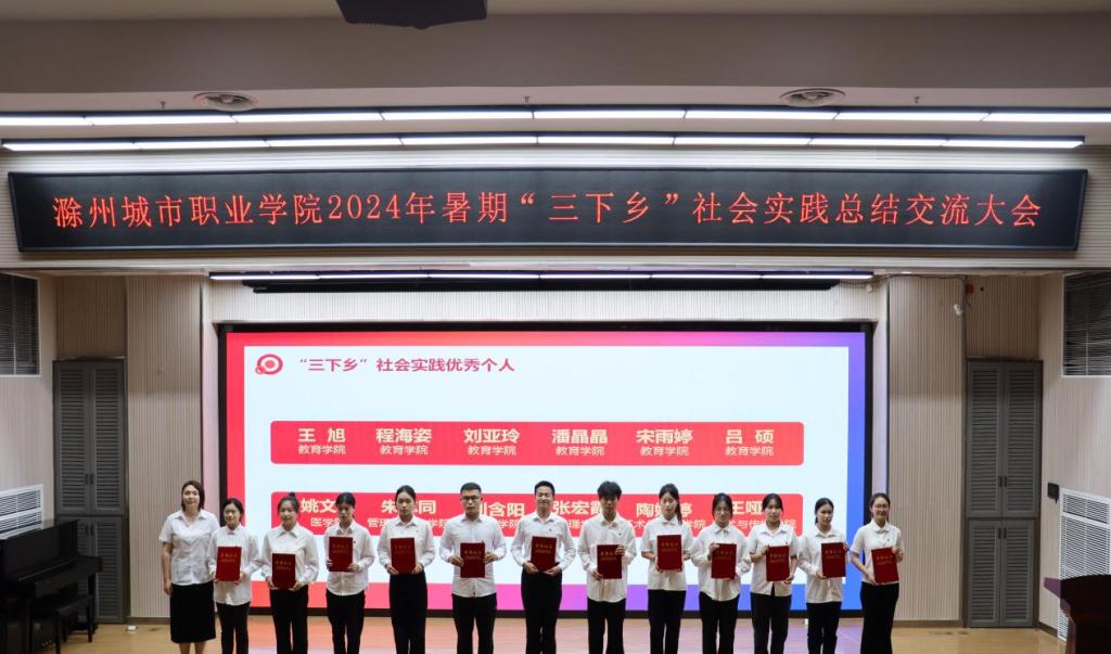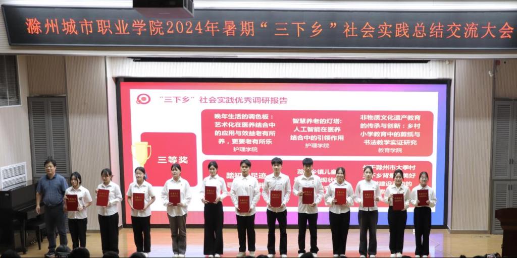 为充分发挥社会实践先进典型的示范激励作用,9月29日下午,我校在图文中心四楼报告厅举办“挺膺担当砺青春 实践归来话成长”滁州城市职业学院2024年暑期“三下乡”社会实践总结交流大会,校党委副书记牛春雨出席活动并讲话,各学院党总支书记、副书记、相关部门负责同志及师生代表300余人参加会议,会议由校团委书记陈婷婷主持。