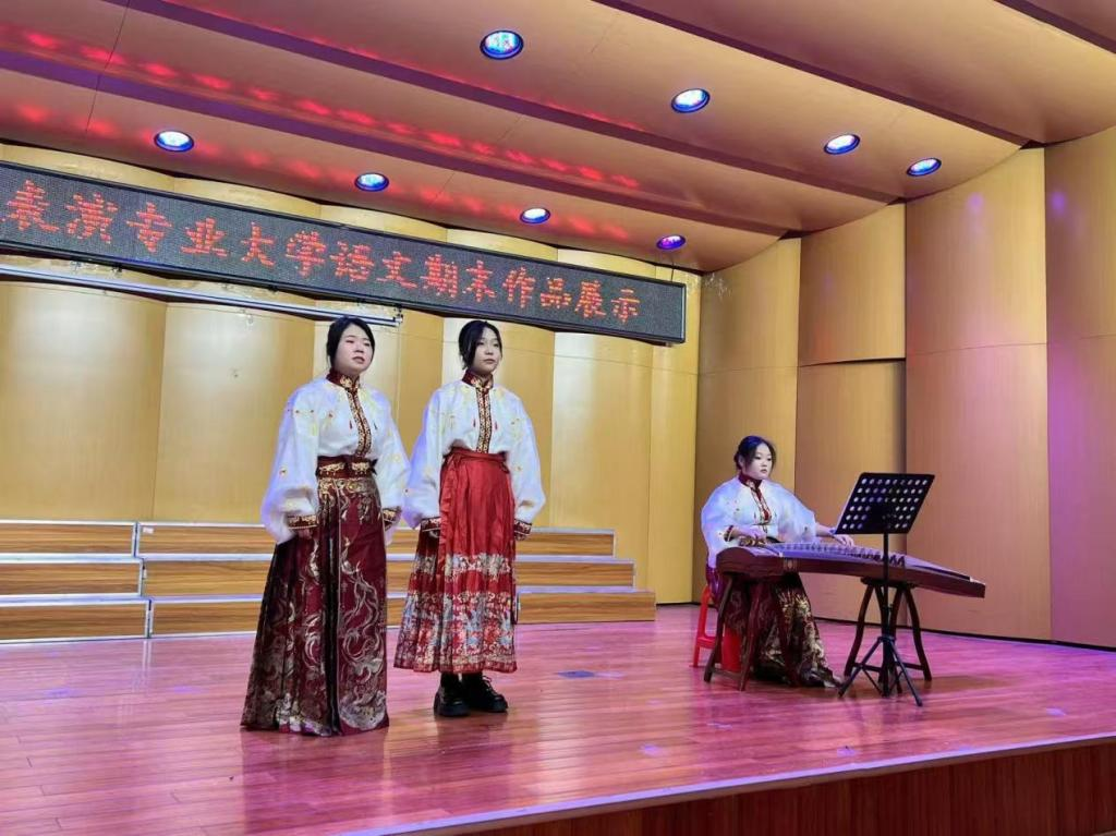 结合学校专业特色,大学语文团队精心选材,挖掘文学作品的思想内涵与艺术价值,找寻与专业课程的融合点,帮助学生以文化视角认知专业知识,促使学生更好的认同专业、提升专业学习水平。学生依托专业知识,选取符合文学作品意境和情感的画面进行舞蹈编排、演唱演讲、美术创作等,实现专业学习和大学语文课程深度融合。如结合音乐表演专业特色,牛春雨老师有针对性地设置研讨话题,创设课堂教学情境,让学生通过课后搜集资料,自由分组、根据自己的特长选择合适的活动任务,结合课程内容,设计音乐表演节目,期末进行汇报演出,形成文化艺术作品。在锻炼学生语言表达能力,活动组织能力等职业能力的同时,增强学生自信心,充分调动学生主动学习的积极性。在期末汇报演出时,因正逢一代伟人毛泽东诞辰日,师生即兴一起诵读《咏梅》,共同感悟着无产阶级革命家无畏艰难、充满信心的浪漫主义情怀。