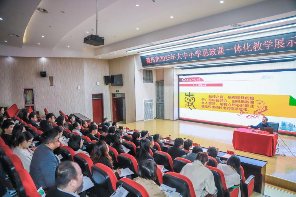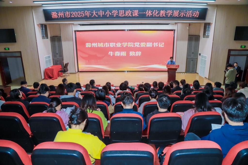 为深入学习贯彻党的二十届四中全会精神,推进大中小学思政课一体化改革创新,深化教学内涵建设,11月3日,学校举办滁州市2025年大中小学思政课一体化教学展示活动。本次活动由中共滁州市委教体工委主办、滁州城市职业学院承办、滁州市大中小学思政课一体化共同体协办,特邀南京城市职业学院思政教育同仁助力,滁州市大中小学思政课一体化建设指导委员会专家委员和全市大中小学的60余位思政课教师全程参加活动,共探思政课育人新路径。