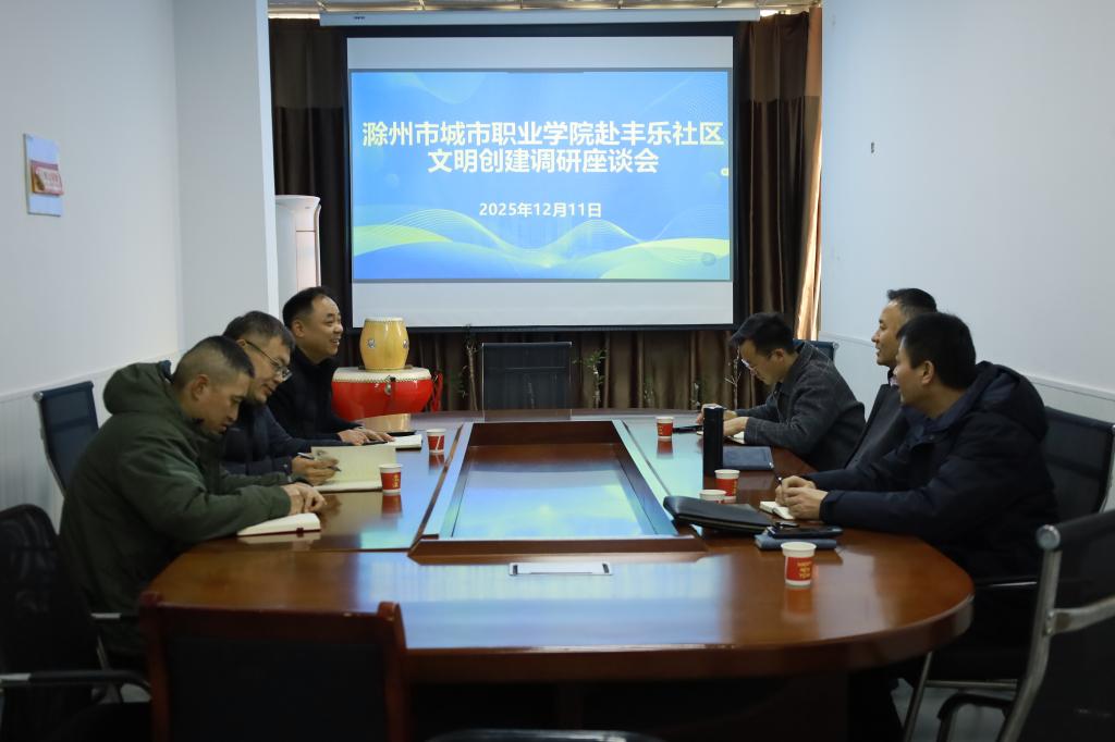 为深入推进文明城市创建工作,强化校社联动协作,凝聚共建共享合力,12 月 11 日下午,滁州城市职业学院党委书记王燕永带队,党委委员、办公室主任陈华兵及相关工作人员一同前往学校包保社区—— 丰乐社区,开展文明创建工作专项调研。丰乐社区党委书记王文及相关负责人全程陪同。