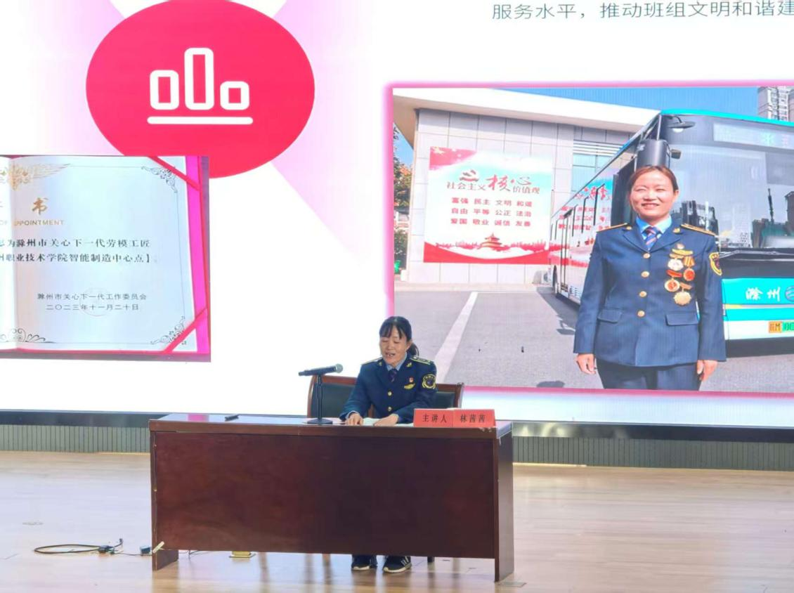 随后,全国五一劳动奖章获得者、滁州市公交公司K1路路长林茜茜以《从公交"出行故事"看全会温度》为题展开宣讲。她生动讲述了"五点"工作法和"五笑"服务法的暖心实践,分享了服务特殊群体、创新节能技术、打造服务品牌的感人故事,用朴实的语言展现了基层劳动者如何将全会精神转化为优质服务与创新实践,让劳模精神在十米车厢熠熠生辉。